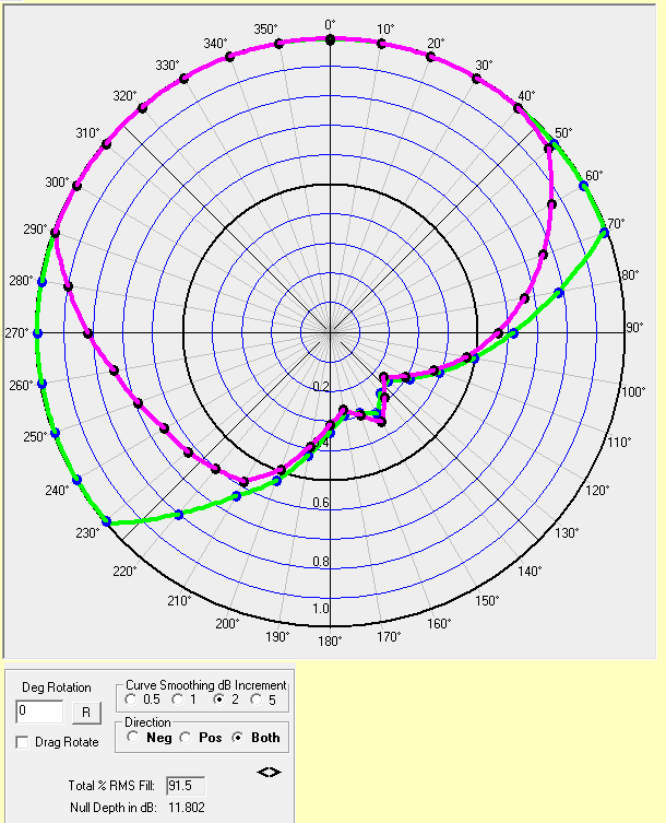 The azimuth chart below is from the new pattern editor showing both a proposed pattern limit (green) and the actual manufacturer’s pattern (Purple). Once displayed, the user can interactively adjust the pattern points to fit inside the limit. The FCC requirement is to have at least an 80% match. The label in the bottom left-hand corner shows that the match is 91.5% and the null depth is 11.802 dB. (The FCC requires an 85% match with the pattern and a null depth less than 15 dB as proposed within the application for construction permit.)